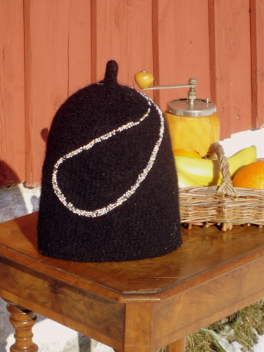Alle mine kaffevarmere og tehætter er strikket i hånden af ren naturuld fra Hjertegarn. Derefter filter jeg dem og tilsidst som prikken over i’et, stikker jeg perler eller rav på.