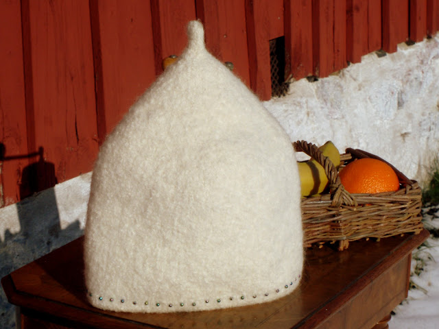Lavet i naturuld dekoreret med hvide perler i dråbe mønster